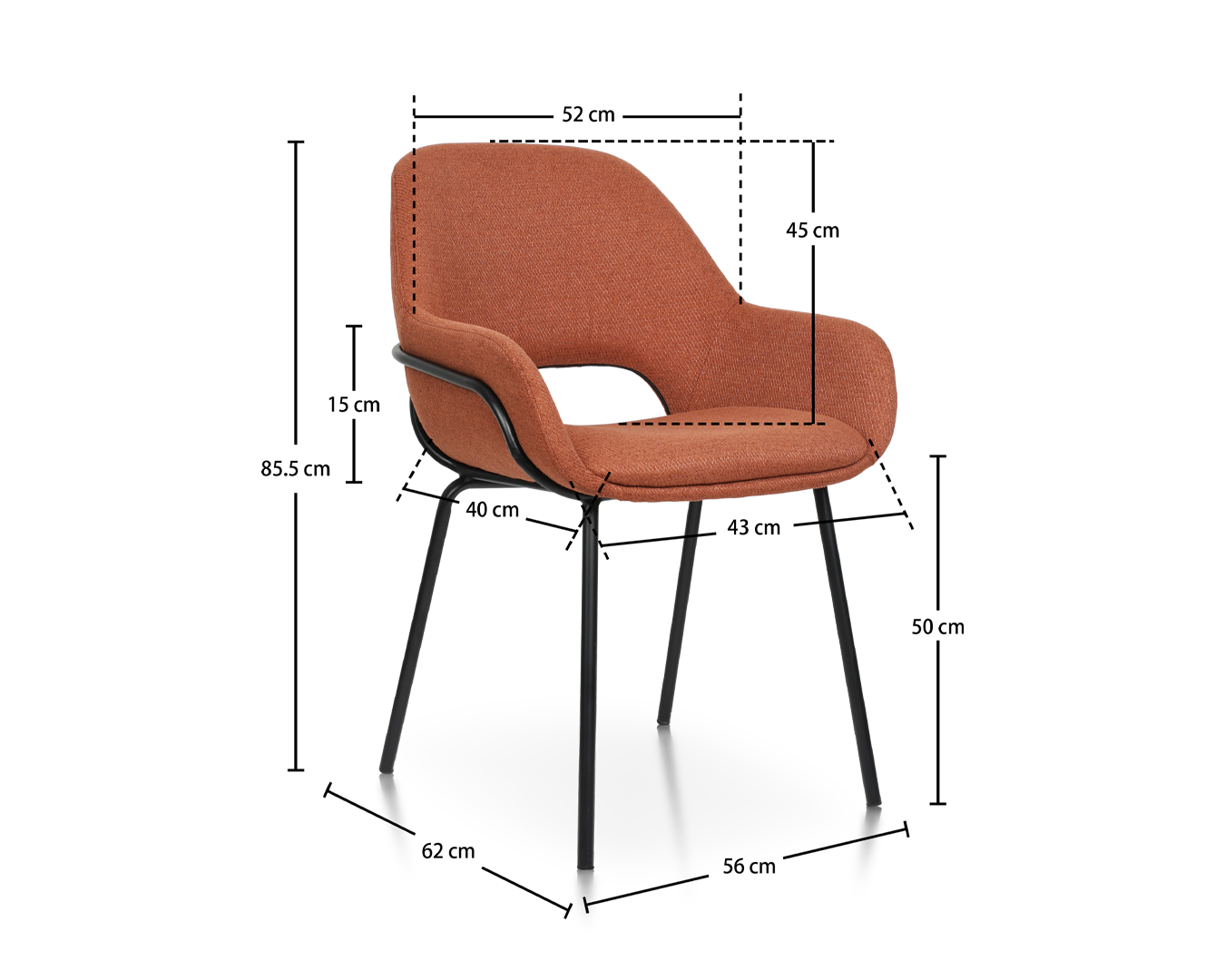 • Con una base di metallo sorprendente e una bellissima miscela di tessuto morbido, questa sedia offre un tocco elegante offrendo al contempo un comfort ottimale per cene lunghe e rilassate. Il design ergonomico e l'altezza del sedile di 50 cm rendono un'esperienza culinaria ideale, mentre il telaio robusto garantisce una durata duratura.